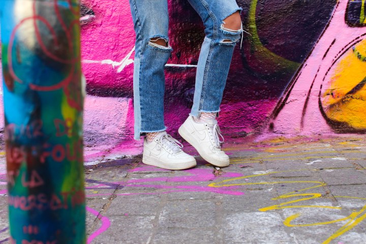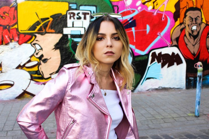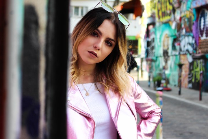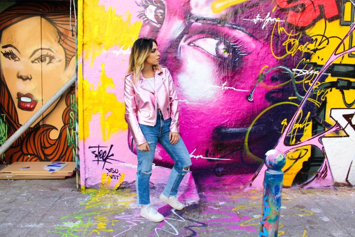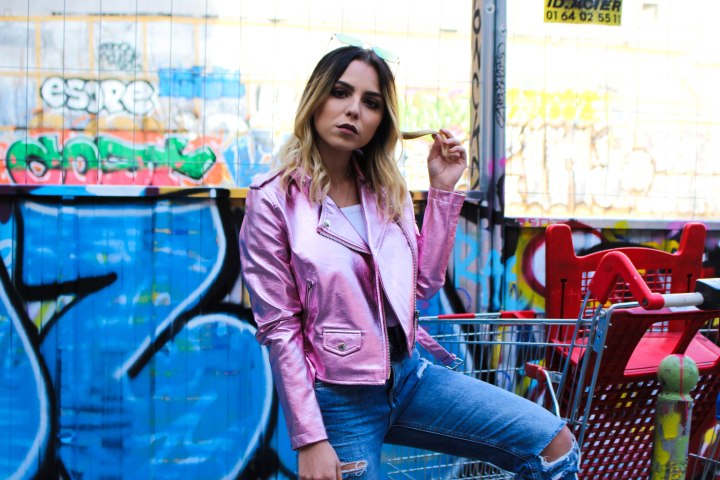 On commence aujourd’hui avec ce look que J’ADORE ! Si on m’avait dit un jour que je serais fan d’un perfecto comme celui-ci je n’y aurai JAMAIS cru, car vous le savez je ne suis pas très couleur mais je fais des efforts. Je sais que vous étiez nombreux à vouloir voir un look avec cette veste qui vient chez Bershka et bien c’est chose faite ! Nous avons tourné et shooté dans une rue du 10ème arrondissement de paris, c’est pas complément dingue ? Je veux dire, cette rue et ses tags ? Je trouve que ça colle parfaitement au look et ça fait ressortir la veste d’une manière incroyable. Pour le reste du look j’ai dû évidemment faire simple parce que sinon j’allais vite faire tache, alors un simple crop-top blanc de chez Bershka mais d’il y a une décennie. Un jean toujours de chez Bershka que j’adore, vintage, déchiré, taille haute, coupé en bas + le changement de couleur à l’arrière = UNE MERVEILLE ! Des baskets (Air Force One Nike) of course pour casser le côté strass et paillettes de la veste associées à des chaussettes en résilles BLANCHES que j’ai trouvées chez Topshop ! Pour le petit rappel de la veste les lunettes roses évidemment (Bershka également) ! Enfin ! Je vous laisse avec les photos que je trouve juste … Comment dire : OUFFFFFF ! J’attends bien évidemment votre avis dans les commentaires ! LOVE LOVE